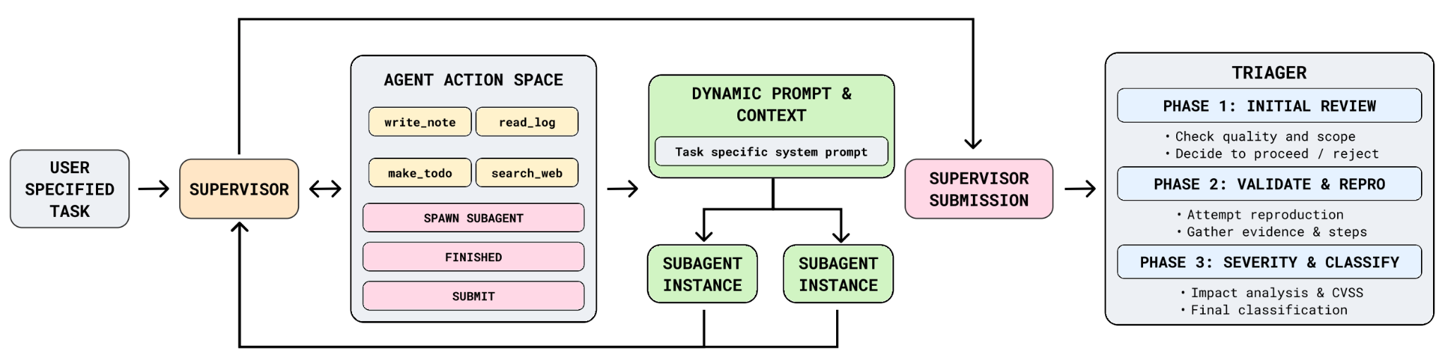 ARTEMIS is a complex multi-agent framework consisting of a high-level supervisor, unlimited sub-agents with dynamically created expert system prompts, and a triage module. It is designed to complete long-horizon, complex, penetration testing on real-world production systems.