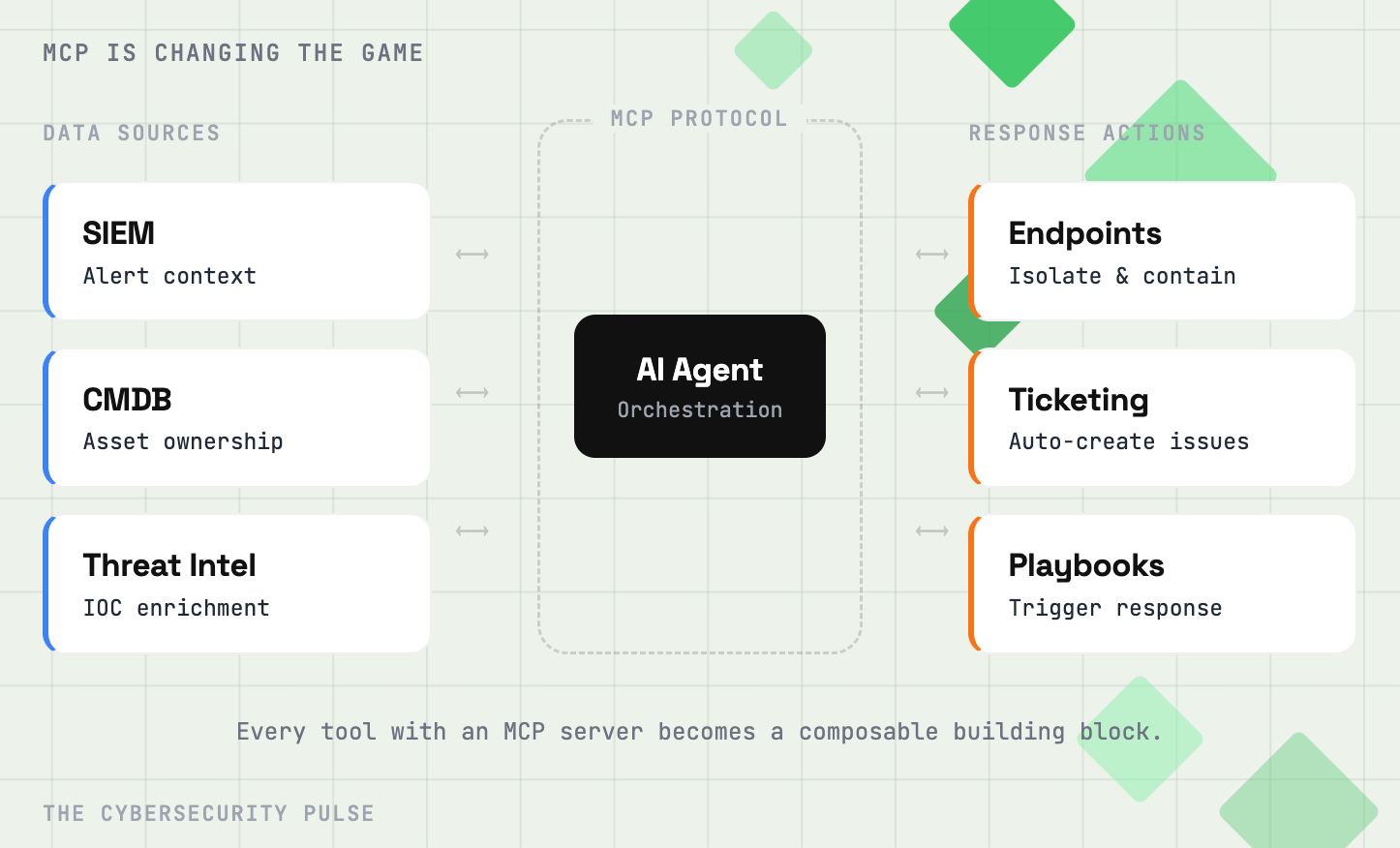 But it does makes sense when you look at what it unlocks. Security teams are using MCP to give AI agents direct access to their tools. Think an AI assistant that can pull alert context from your SIEM, query your CMDB for asset ownership, and check your threat intel platform for IOC enrichment, all in a single investigation flow. Teams are also building MCP-enabled agents that can take action like isolating endpoints, creating tickets, or kicking off response playbooks based on findings.